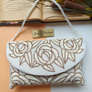 This White Gold Floral Beaded Clutch features a stunning handmade design with intricate floral beadwork and elegant white gold accents. Perfect for special occasions, it offers a timeless and sophisticated touch to your ensemble.